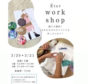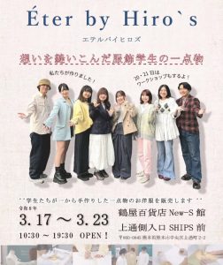 ヒロ・デザイン専門学校プロフェッショナルデザイン科2年生が主体となって開催するオリジナルショップが今年も開催決定!! 学生たちがイチから手作りした一点物のお洋服を販売します♪   ショップ名:Éter by Hiro’s ~~変わらない想い、変わる私~~ ヒロ・デザイン専門学校の学生達がデザインから縫製、販売まで全てを手掛けた商品を販売 開催期間:3月17日(火)~3月23日(月) 開催会場:鶴屋百貨店 New-S館1階 上通側入り口 SHIPS前 あなただけの1着をぜひさがしにきてくださいねっ!☺️ ショップ名の由来 ラテン語のaeternus(永遠)やether(空・満たすもの)をイメージ源に、流行に左右されすぎず、長く大切にされる服を届けたいという意味が込められています。 Éter  エテルとは 「どんな時代も変わらず寄り添う愛されるスタイルと、自由な自己表現」 日常の中でふと足を運び心を解き放てるようなショップを目指します   3月20日と21日にはワークショップも開催!! ①12:00〜14:00 ②15:00〜17:00 参加費500円 メニューはくるみボタン作りとミニデザイナー体験の2つをご用意しています♪       Instagramでは商品の事など随時紹介中です!フォローして情報チェックして下さい♪